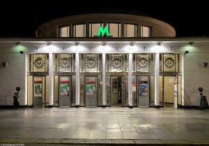 Metro: Wo sich die Symbole des Kapitalismus mit der Ästhetik des Sozialismus verbinden. Zu sehen der ostwärtige Bahnsteig, im Tunnel erahnt - und vor allem erhört - man schon die Einfahrt einer M1 in Richtung Lisova. |