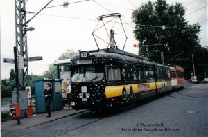 Zu sehen der M-Wagen *602 bei der Einfahrt in die Schleife am Oberforsthaus, als die 21 wgen Stadionumbaus nur bis Oberforsthaus fuhr und der M-Zug (damals noch 602) öfter mal wegen Wagenmangel auf Linie kam... |