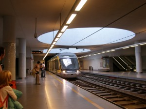 Während Lissabon sich einen schicken Fernbahnhof zur Expo 98 geleistet hat, hat man in Porto in den weit außerhalb gelegenen Flughafen investiert. An diesen neuen Glaspalast schließt natürlich auch eine Halle für die Metro do Porto an. Mit Platz für 3 Gleise ist die zwar übertrieben groß, aber dafür hat man an der Gestaltung der übrigen Stationen gespart. Zur Zeit wird der Ast zum Flughafen alle 20min bedient, besonders zwischen Fonte do Cuco und dem 4-gleisigen Abweigbahnhof Verdes sieht man der Trassierung an, dass es sich um eine ehemalige Eisenbahnstrecke handelt (lange Stationsabstände, Felder, ...). Vermutlich sieht der Rest der Linie B ab Verdes bis Povoa de Varzim ähnlich aus. |