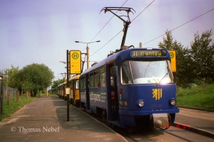 Bei genauerem Hinsehen fällt beim rechten Zug auf, dass die beiden hinteren Wagen noch das alte Farbschema rot-beige tragen. Solche Kombinationen mit einem gelb-schwarzen T4D-MS gab es nicht allzu häufig. |