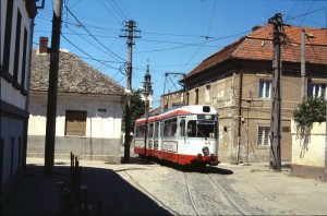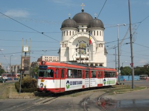 Ein weiterer alter Bekannter Tw 43 zwischen den Haltestellen Podgoria und Polivalenta inmitten einer vierspurigen Straße. |