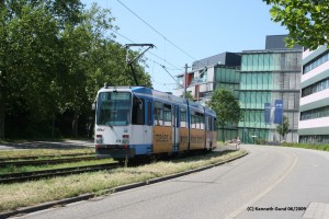 Wagen 252 als Linie 24 auf dem Weg in Richtung Rohrbach. Anders als auf dem Zielfilm angezeigt endet dieser Zug jedoch schon an der Rheinstraße, da der Streckenabschnitt von dort bis Rohrbach derzeit nur eingleisig befahrbar ist. Wenn die Baumaßnahmen abgeschlossen sind, werden alle Haltestellen in der Rohrbacher Straße barrierefrei ausgebaut sein.