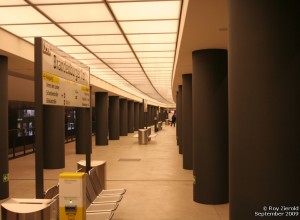 Typische Bahnsteigarchitektur auf der U7-West: Webung, Graffiti, 90er-Jahre-Formen. |