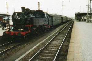 Eine ozeanblau-beige V100 (BR 211 oder 212) steht im Sommer 1996 mit einem mintgrünen Silberlingszug noch am alten Bahnsteig in Nürnberg Nordost zur Abfahrt nach Gräfenberg bereit. Das alte Bahnhofsgebäude war zu diesem Zeitpunkt bereits abgerissen, aber der alte Bahnsteig war noch in Betrieb. In der Mitte ist bereits der neue Bahnsteig im Bau, von dem die Züge der R21 nach Gräfenberg heute abfahren. Am Standpunkt des Fotografen befindet sich heute der Zugang zum neuen Bahnsteig. |