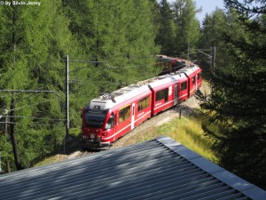 Hier erreicht der Allegra 3502 Poschiavo. Dem Hauptort des Puschlav. Wie gut zu erkennen ist befindet sich das vordeste Glied des Triebwagens bereits in der Ebende des Bahnhofs Poschiavo, während der Rest sich noch in 7%-Rampe befindet. Solche steilen Passagen kommen am Bernina sehr oft vor. Die Bernina-Bahn bewältigt diese ohne Zahnrad. |