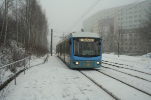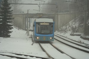 Aus dem Nebel taucht Tw 606 auf, überquert gerade die Kreuzung Stollberger Str./W-Sagorski-Str. in Richtung Hutholz. |