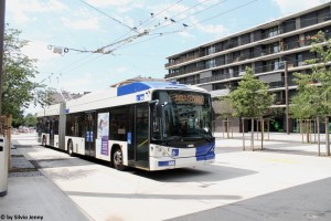 Werktags verkehren auf der Linie 7 Anhängerzüge. Am Wochenende sind jedoch genügend Gelenkbusse vorhanden, um alle Trolleylinien mit Gelenkbussen zu bedienen. Vor 12 Jahren wäre dies noch nicht möglich gewesen, da die tl erstmals 2002 Gelenktrolleybusse bestellten. |