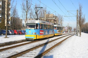 Der Winter ist heute zurück gekehrt. Bei leichtem Schneefall passierte Tw 513+514+757 gerade die Steinhauspassage zwischen den Haltestellen Tschaikowskistraße und Reineckerstraße. |