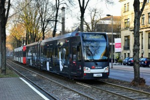 Niederflurwagen 4092 wurde eine neue Ganzreklame für das "Möbelhaus Höffner" angebracht. Hier zu sehen auf der Cäcilienstraße am 23.01.2017. |