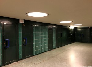 Hier erkennt man die hintereinander angeordneten Treppenanlagen - vorne Richtung Rathaus Steglitz, hinten Richtung Osloer Straße. Die raumschiffartige Atmosphäre wird inzwischen durch Vandalismus und die links derzeit laufende Asbestsanierung stark gestört. |