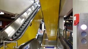 Auch eine eher brutalistisch gehaltene Haltestelle, wobei die Ziegelmauer mit bunten Förmchen ja eher so 80er ist. Die Anzeige oben links gibt Übrigens einen am gegenüberliegenden Bahnsteig stehenden Zug der Linie 6 an, damit ein hier gerade nicht vorhandener Fahrer wüsste, dass er warten soll. |