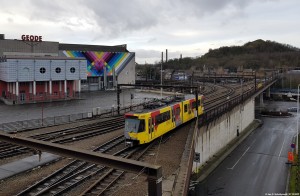 Übersetzt sich laut Google zu: Schlackenhalde. Da klingt Französisch ja glatt mal besser. Im Vordergrund sehen wir das gewaltige Gleisdreieck der Stadtbahn, das m. W. 1980 in Betrieb ging. Links geht es nach Charleroi Ouest und hinten erkennt man die Haltestelle Piges, die laut Fahrplan schon in Dampremy, also hinter der alten Stadtgrenze liegt. Charleroi war echt nicht groß. |