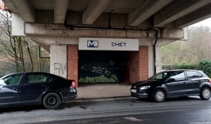 Zwischen Neuville und Chet verläuft die Metro als Hochbahn. Von der einen zur anderen Haltestelle direkt laufen kann man allerdings nicht, der Weg wird durch ein Fabrikgelände versperrt. Man kann aber hinten schon ihr Dach erkennen. |