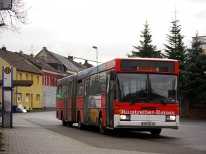 Der zweite neben dem letztens von Dennis gezeigten O405G von Rumtreiber-Reisen ist dieses Exemplar hier aus dem Jahre 1991 (und damit immerhin 10 Jahre älter als ich), welches zuvor bei Langreder in Niedersachsen und davor bei der KVG in Kiel zum Einsatz kommt. Er trägt, abgesehen von der Werbung, noch den originalen Kieler Lack. |