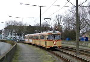 So sieht es an der zweigleisigen Ankunftshaltestelle aus. In Gröpelingen gibt es zahlreiche verschiedene Fahrwege. Und wem es nicht reicht, nur auf dem Betriebshof im Kreis fahren zu können, der kann auch eine größere Runde drehen. Hinter der Grünfläche im Hintergrund (= Gröpelinger Friedhof) und dem roten Gebäude gibt es nämlich gleich die nächste Verbindung zwischen den Linien 3/5 und 2/10. Dort hat der Museumswagen 557 gerade seine Runde gedreht.