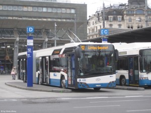 Nur die Verstärkerkurse in der HVZ auf der Linie 1 werden mit normalen Gelenkbussen gefahren. Zum Teil kommen dazu auch Autobusse zum Einsatz. Ansonsten sind auf der Linie 1 nur Doppelgelenktrolleys zu sehen. |