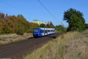 Der blaugraue Alstom-Schienenbus passiert die westlichen Ausläufer des Boehringer-Geländes und fährt weiter nach Gau-Algesheim. |