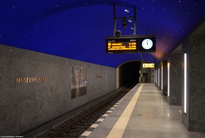 Zwischen den per Schildvortrieb aufgefahrenen Bahnsteigröhren befindet sich noch eine dritte Röhre, aus der sich dieser Korridor ergibt. Dieser verbindet im wesentlichen die Bahnsteigseiten miteinander, schafft aber auch einen ganz eigenen Raum für sich. |