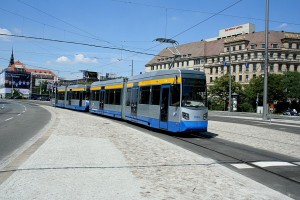 Die 3 Leipziger Niederflurtypen hintereinander, vornean NGT8 1144, gefolgt von Leoliner 1303, hintendran ClassicXXL 1212.