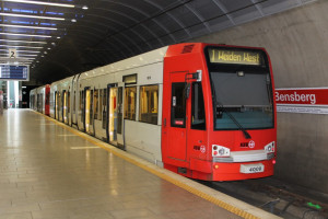 4077 ist die neue "Team Herzschlag"-Bahn der KVB AG. Das mit Fotos von Mitarbeiterinnen und Mitarbeitern gestaltete Fahrzeug ist zusammen mit einem ebenfalls in gleicher Art gestalteten Bus ein Dankeschön für den Einsatz der Beschäftigten. Die Fahrzeuge sollen aber auch dazu beitragen, neue Mitstreiterinnen und Mitstreiter zu gewinnen. Auf dem Foto ist 4077 auf Höhe des Aachener Weihers am 03.05.2023 zu sehen. |