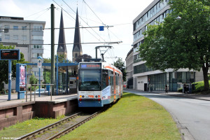 Am 05.08.2021 hält der M8D 566 als Linie 1 an der Haltestelle Bethel auf dem Weg nach Schildesche. |