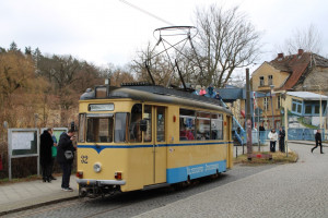 32 ist am Tag der Verabschiedung der Gotha-Wagen am 01.03.2025 von S Rahnsdorf kommend an der Woltersdorfer Schleuse angekommen und wird gleich zur Rückfahrt nach S Rahnsdorf an die Abfahrtsstelle aufrücken. |
