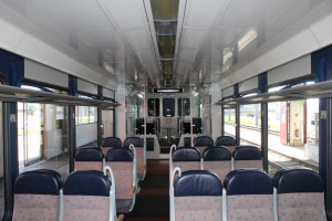 1. Serie GTW 2/6 151-158 von innen mit Blick von Führerstand auf Übergang. Auffällig sind hier die quer angeordneten Gepäckablagen an den Rückwänden beim Übergang. Bei der 2. Serie 159-164 sind diese längs über den Fenstern angeordnet. |