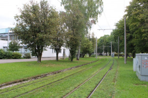 An dieser Stelle wird sich vsl. ab 2032 der Nahverkehrsknoten Linz Urfahr-Ost befinden, hier von Süden aus gesehen. Oben die Lokalbahn, unten die Straßenbahn. Dazu soll die Straßenbahn an dieser Stelle unter die Erde verlegt werden, wodurch die Linzer Straßenbahn neben dem Tunnel am Hauptbahnhof einen zweiten unterirdischen Abschnitt bekommen wird. Die Kehrschleife links wird wahrscheinlich in diesem Zusammenhang aufgehoben. |