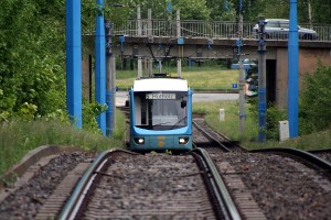 Nachdem die linke Bahn (in dem Fall 901) abgefahren ist, wechselt die rechte (aus der Stadt angekommene) Bahn (908) an einem Gleiswechsel auf das stadtwärtige Gleis. Danach setzt sie zurück in den Haltestellenbereich und wartet dort auf die vom Bus umsteigenden Fahrgäste. Deswegen verkehren während der Baumaßnahmen nur ZR-Varios. |