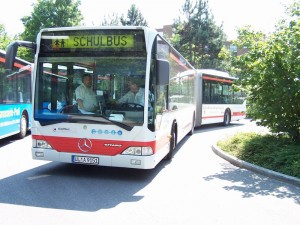 Bei längeren Pausen der Linie 3 fahren viele Busfahrer auf den Parkplatz der St. Martinus Schule, dort ist es schattiger und ruhiger. Hier Wagen 215 zur Weiterfahrt nach Gornhofen. |