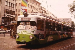 Wagen 3751 fährt im Januar 1985 duch die Verschneite Landschaft unterwegs nach Thielenbruch auf die Haltestelle Herker Straße zu. Heute befindet sich an dieser Stelle die Tunnelrampe der mülheimer U-Bahn. |