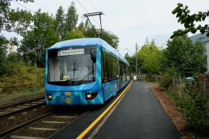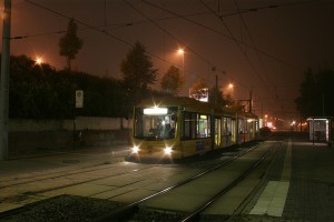 als Linie 5 Richtung Morgenleite zwischen den Haltestellen Moritzhof und Gustav-Freytag-Straße. Im Hintergrund die Gegenbahn der Linie 5 mit Tw 901. |