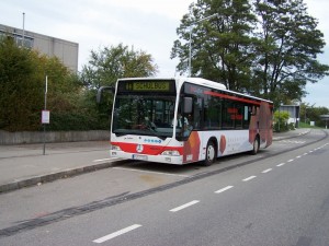Hier sind gleich 3 Fahrzeuge auf einem Bild (leider sind nur 2 zu sehen). Im Vordergrund ein Citaro G zum Güterbahnhof Weingarten, dahinter eine Leerfahrt ebenfalls zum Güterbahnhof, und neben dem Citaro G (nicht zu sehen) ein Citaro nach Wolpertswende. |