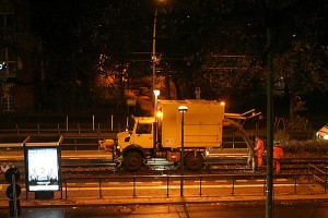Nachts wird das Laub von den Gleisen gesaugt. |