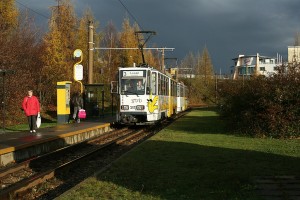 Dämmerung an der Haltestelle Fußgängerbrücke. Warum die Haltestelle so heißt, kann man auf dem Bild gut erkennen. |