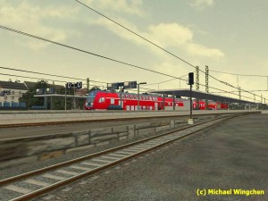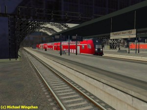 Ein RE in Bahnhofsvorfeld von Frankfurt Hbf.