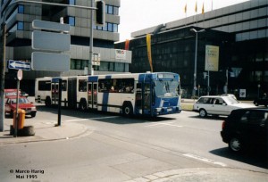 Wagen 217 wartet am Karstdt auf seine Weiterfahrt zum Rodenhof. Zu diesem Zeitpunkt hatten die Fahrzeuge noch den alten Linien- und Zielfilm. Mit Einführung der Saarbahn im Oktober 1997 wurde alle Wagen auf Matrix umgerüstet und ab 1998 wurden die Renaults durch neue Erdgasgelenkbusse ersetzt. Ein Stück Busgeschichte ging damit in Saarbücken zu Ende... |