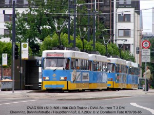 Noch eine Woche sind in Sachsen Ferien. Langsam will man wohl die Leute wieder an Tatras gewöhnen, wo bis auf einen Tag (6.8., 521+522 auf der 6) sonst die ganzen Ferien über nur Variobahnen eingesetzt wurden. Neben dieser hier eingesetzten Traktion fuhren noch 521+522 auf der Linie 6 und der Großzug 513+514+757 auf der Linie 5. Für einen Samstag richtig viel. |
