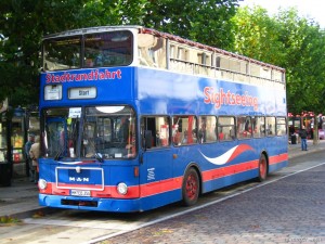 Der Doppelstockbus gehört den Nahverkehr Schwerin.