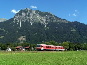 628 102 überquert als RB nach Oberstdorf bei Fischen die Iller. |