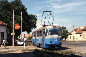 Tw 97 befährt 1997 den BÜ in der Nähe der Haltestelle Confectii. Im Vergleich zu den Bildern aus Teil 1 ist hier noch der alte Straßenzustand erkennbar |