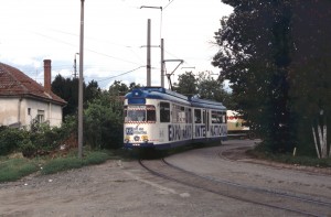 An der Schleife Cpt Ignat begegnet der Ulmer Tw 01 dem Essener Tw 1751, der während seiner Pausenzeit im normalerweise weiter führenden Streckengleis abgestellt ist. Die Strecke nach Pt Romana war ab hier wegen Gleissanierungen außer Betrieb |