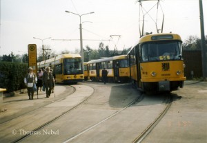 Als Linie 7 nach Gorbitz. Rote T4D wurden nach der Wende recht schnell selten, da viele schnell in die Stadtfarben schwarz-gelb umlackiert wurden.