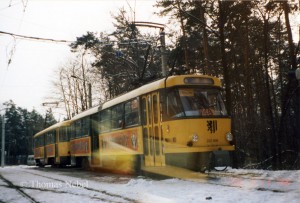 Kurz vor der Liniennetzreform 1996 verkehrt einer der ganz wenigen roten und mit Polstersitzen versehenen T4D auf der Linie 7 Richtung Hellerau. Die Haltestelle gibt es heute nicht mehr, dort wird nur durchgefahren. |