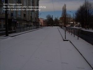 Straßenbahntrasse in Pankow während des Streiks. Die Schienen zeigen bereits deutliche Ansätze von Rost. |