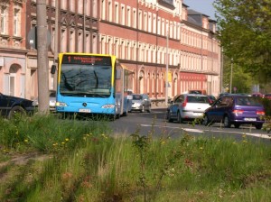 Linie 72 bei der Anfahrt auf die Haltestelle "Roter Turm" mit dem Ziel Heimgarten. Im Versatz von 10 min gefolgt von der Linie 62. Daraus ergibt sich aus der eigentlichen Taktfrequenz von 20 min eine 10 min-Folge für den Hauptteil der Strecke. |