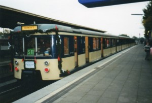 471 081 während des kurzen Einsatzes auf der S21 im Frühjahr 2000 in Nettelnburg. Im Juni 2000 wurde 471 081 zusammen mit 471 014, 075 und 080 an die Sammlung Exner nach Althüttendorf abgegeben, wo 471 081 zusammen mit den anderen Fahrzeugen im März 2008 verschrottet worden ist. |