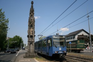 Ein Solo-B-Wagen im morgendlichen Berufsverkehr auf der 63. Da war Fahrgaststapeln angesagt. Damit auch der Letzte überzeugt ist, dass dieses Bild nicht etwa an einem Sonntag oder so entstanden ist, sei auf das DFI links im Bild verwiesen, welches die baldige Ankunft der Linie 67 avisiert, die nur an Schultagen morgens fährt.