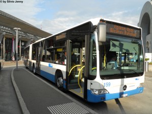 Die erst 12 Jahre alten Volvo/Hess B10L(A) wurden bei der vbl bereits ersetzt. Dafür kamen neue CitaroII G. Der erste von ihnen, der Nr. 158 ist hier auf der Linie 20 in Richtung Ennethorw unterwegs. Wie ihre Vorgänger sind auch diese neuen Citaros mit 4 Türen, Klimaanlage und Kasse für den Überlandverkehr ausgerüstet. |