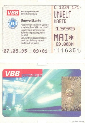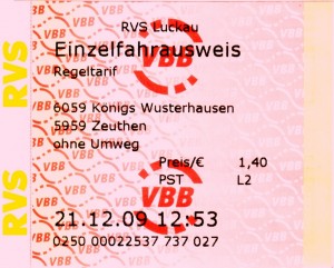 Das VBB-Ticket wurde von der BVG am 17.01.2009 am Automaten ausgegeben und wurde am Samstag 3. KW 2009 entwertet. Es gilt von Berlin ABC bis nach Bestensee im Landkreis LDS. Tickets, die von Berlin bis in einen Landkreis gehen, werden immer für ein festes Datum ausgegeben und sind somit nur an diesem Tag gültig. Das gilt auch, wenn sie nicht entwertet werden. |